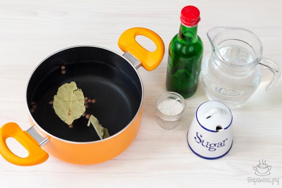 1. Соедините компоненты маринада: воду, соль, сахар, 6-процентный столовый уксус, лавровый лист и несколько горошин душистого перца. Перемешайте и доведите до кипения.