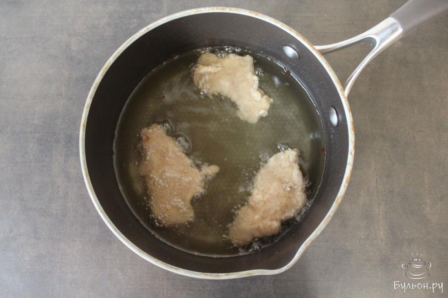 3. Взять оставшийся кукурузный крахмал, отложить в небольшую чашу 3 ч. л., они нам понадобятся для приготовления кисло-сладкого соуса. В оставшуюся часть крахмала обмакнуть каждый замаринованный кусочек мяса и обжарить во фритюре.