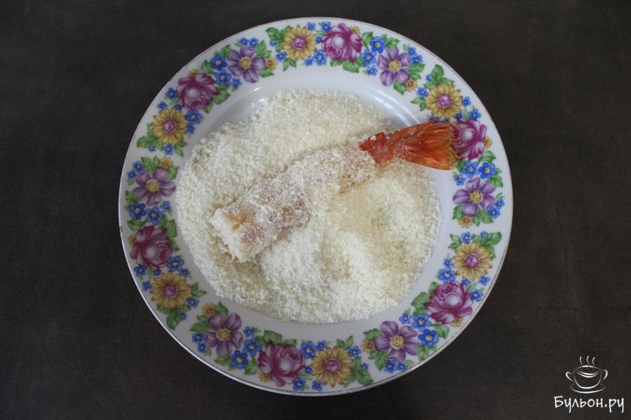 4. Чтобы придать лангустинам вкус, слегка подсаливаем их и панируем в муке, держа пальцами за хвостик. Сам хвостик панировать в муке не нужно.