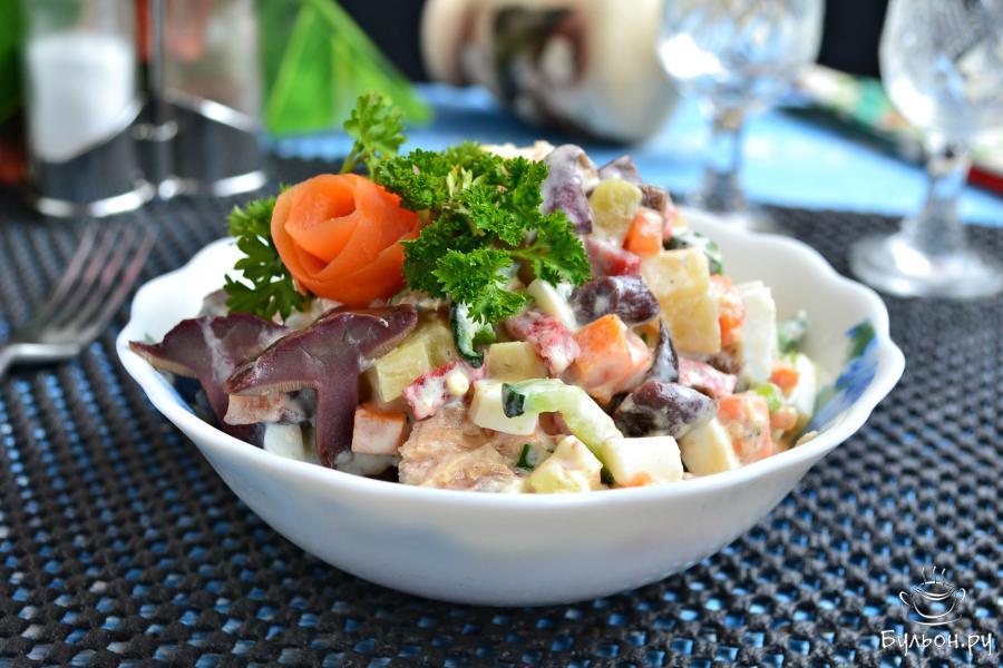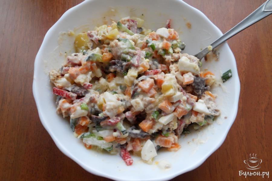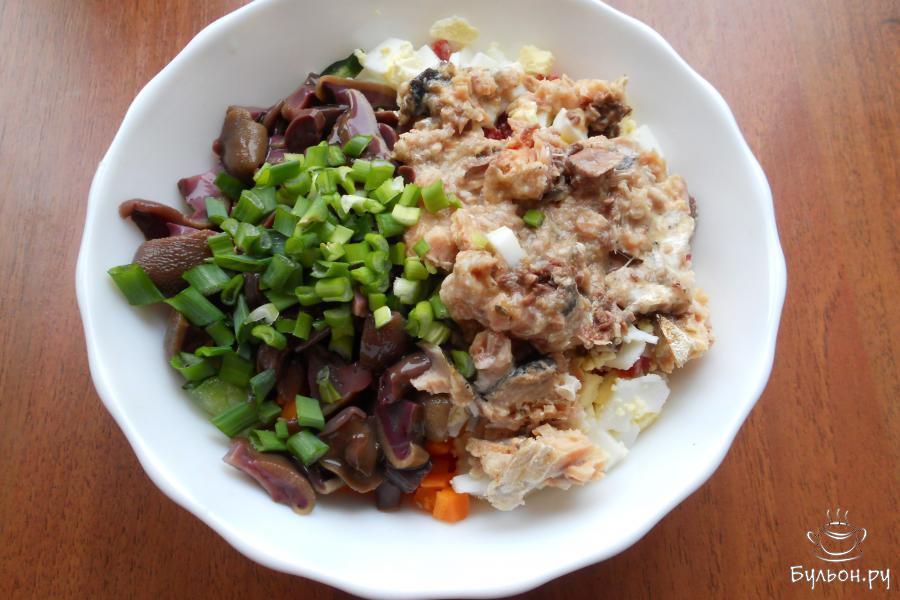 Салат с рыбными консервами, с добавлением маринованных грибов - необычайно вкусный, сытный салат, который можно предложить своим близким к ужину, можно приготовить его и для гостей. У меня - домашние маринованные грибочки, подойдут любые, в том числе и магазинные шампиньоны. Я добавила в салат немного сырокопченой колбасы, чтобы придать интересный вкус. Вместо майонеза можно заправить салат сметаной, добавив к ней немного горчицы.