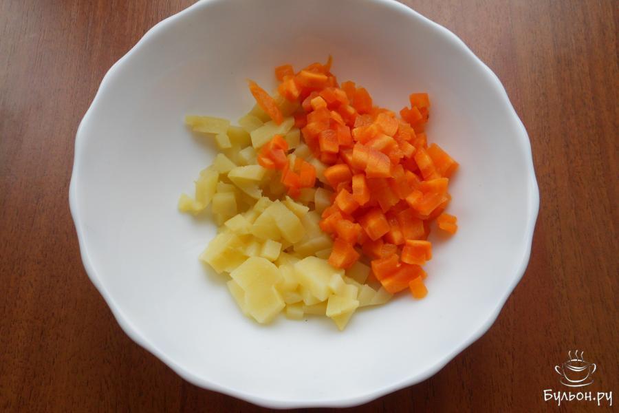 1. Предварительно отварить картофель, морковь и яйца, остудить и очистить. Картофель и морковь нарезать небольшими кубиками.