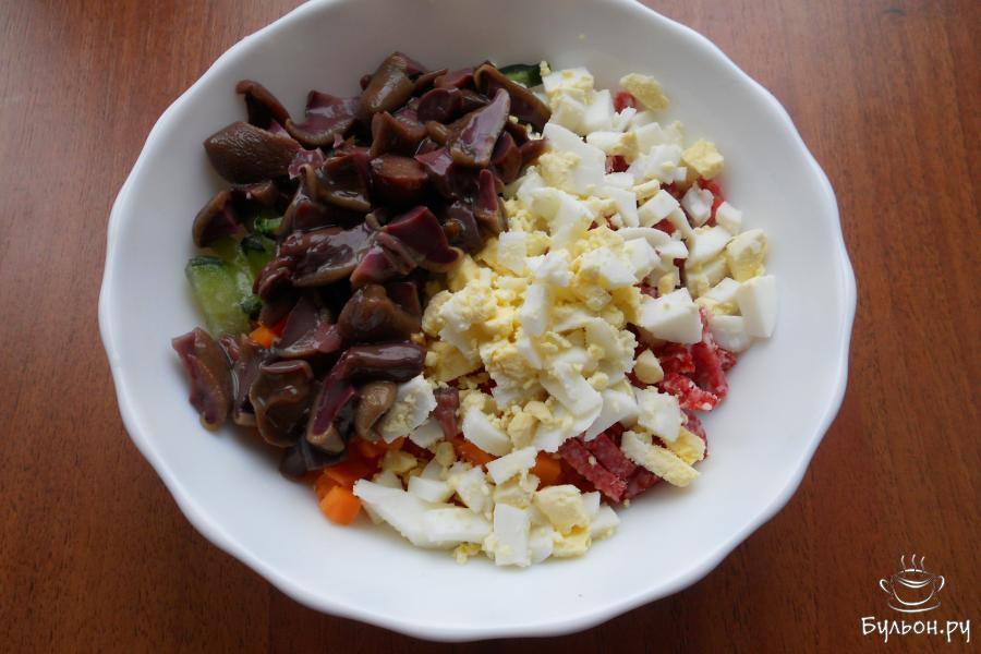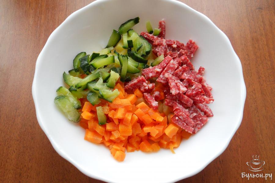2. Добавить порезанную кубиками или брусочками сырокопченую колбасу и также порезанный свежий огурец.