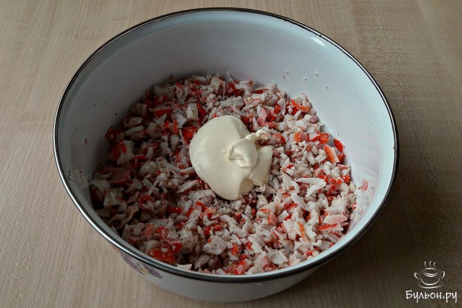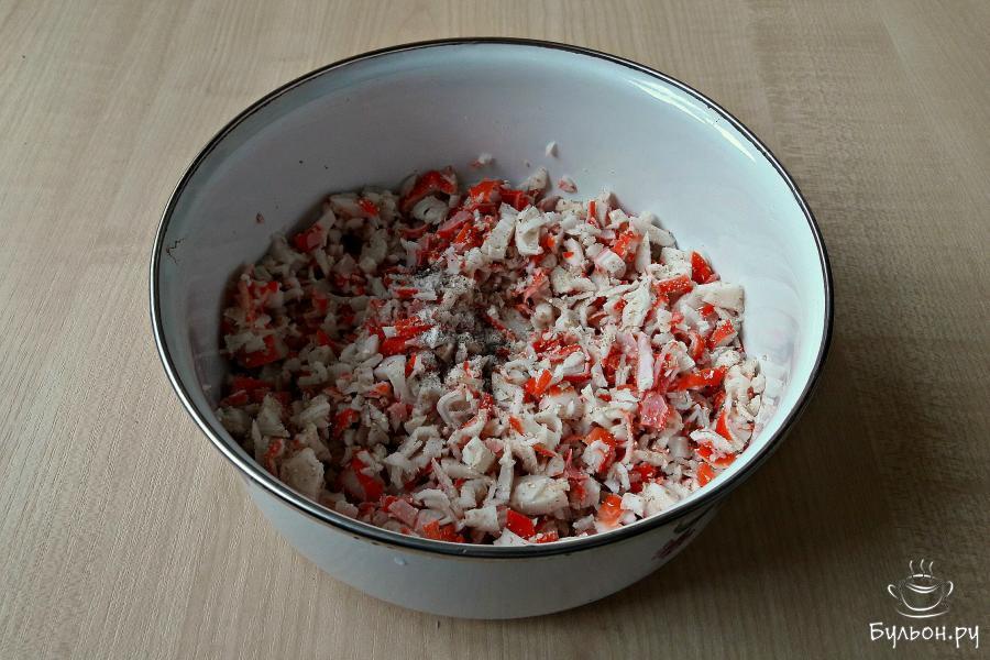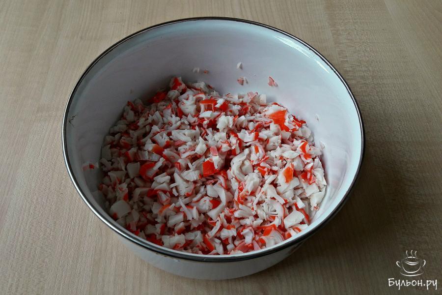 2. Измельчаем крабовое мясо. Мне нравится делать это ножом, но это дело вкуса. Вы также можете измельчить мясо блендером или мясорубкой, это не принципиальный момент.