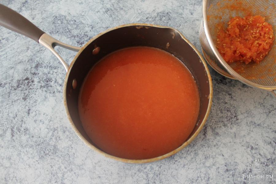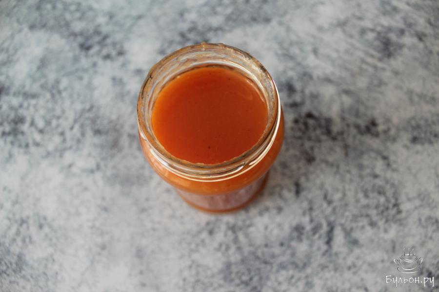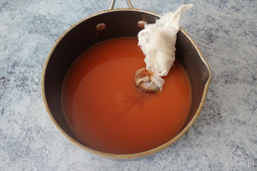 8. Убрав мешочек, снова перетираем через сито соус, переливаем в кастрюлю, доводим до кипения, после чего разливаем по стерилизованным емкостям, закрываем стерильными крышками. Банки переворачиваем и прячем их под одеяло. На следующий день убираем соус на хранение в темное прохладное место.
