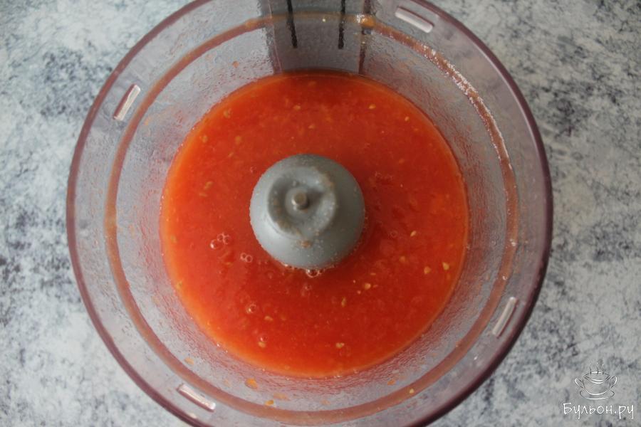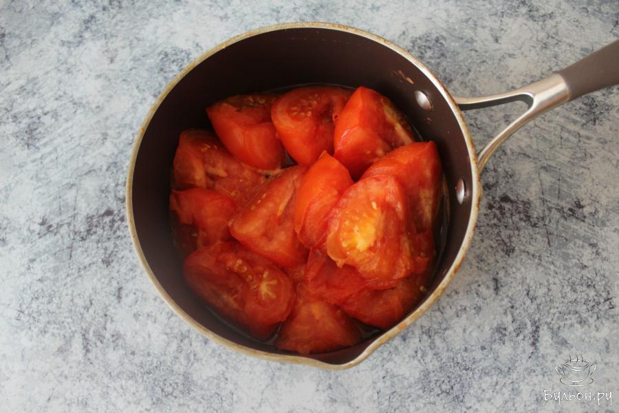 1. Разрезаем помидоры на дольки, удаляя плодоножку, пересыпаем в кастрюлю, вливаем половину воды и под закрытой крышкой на маленьком огне тушим 20 минут.