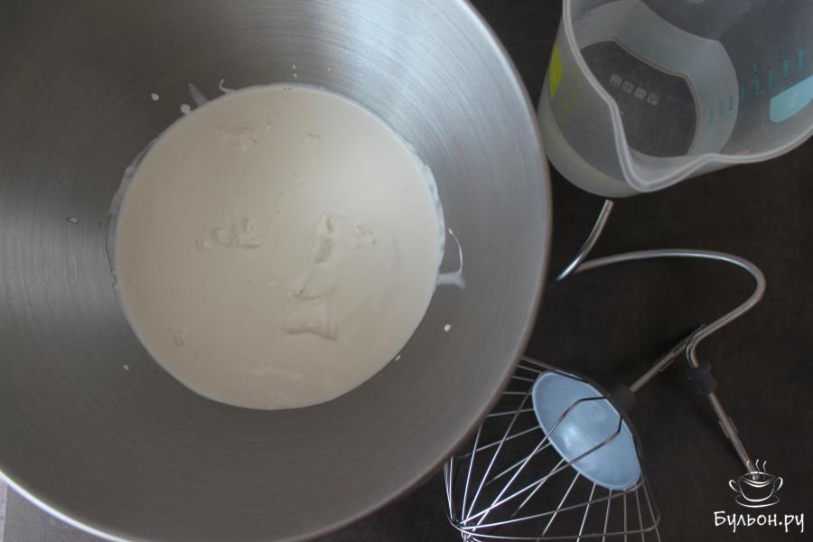 2. Взбивать венчиком на высокой скорости охлажденные сливки. Постепенно сливки начнут густеть. Когда венчиком будет уже тяжело взбивать, начать снижать скорость.