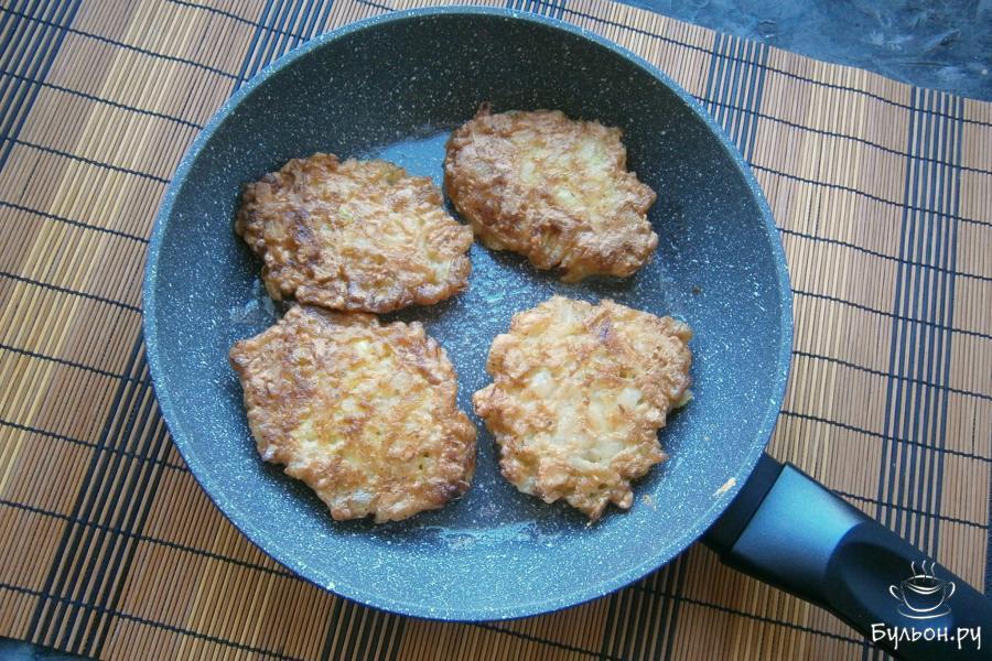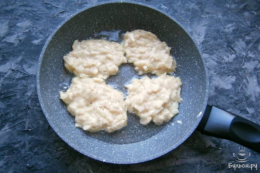 6. Масло разогреть в сковородке и выложить луковую массу ложкой в виде котлет или оладий. Жарить цыбульники на небольшом огне до румяности.