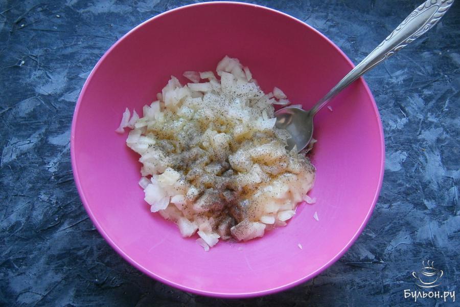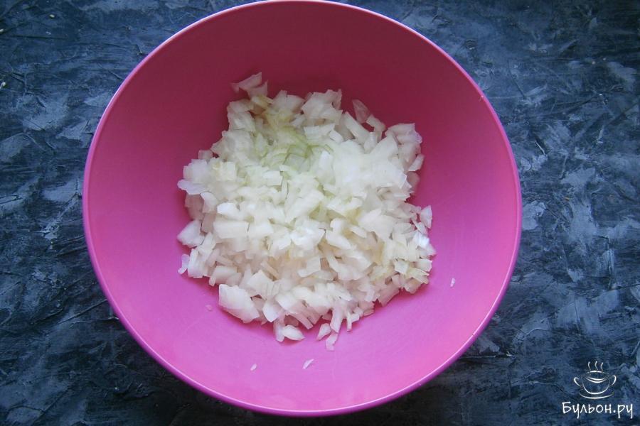 2. Порезать лук ножом как можно мельче. Главное здесь - именно порезать-порубить, а не измельчать блендером или через мясорубку.