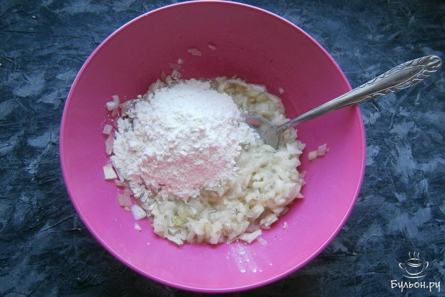 5. Добавить муку и разрыхлитель (можно - просто соду 1/4 ч. л.). Лук с остальными ингредиентами перемешать. Муки может понадобиться чуть больше, масса должна быть такой, как на обычные оладьи.