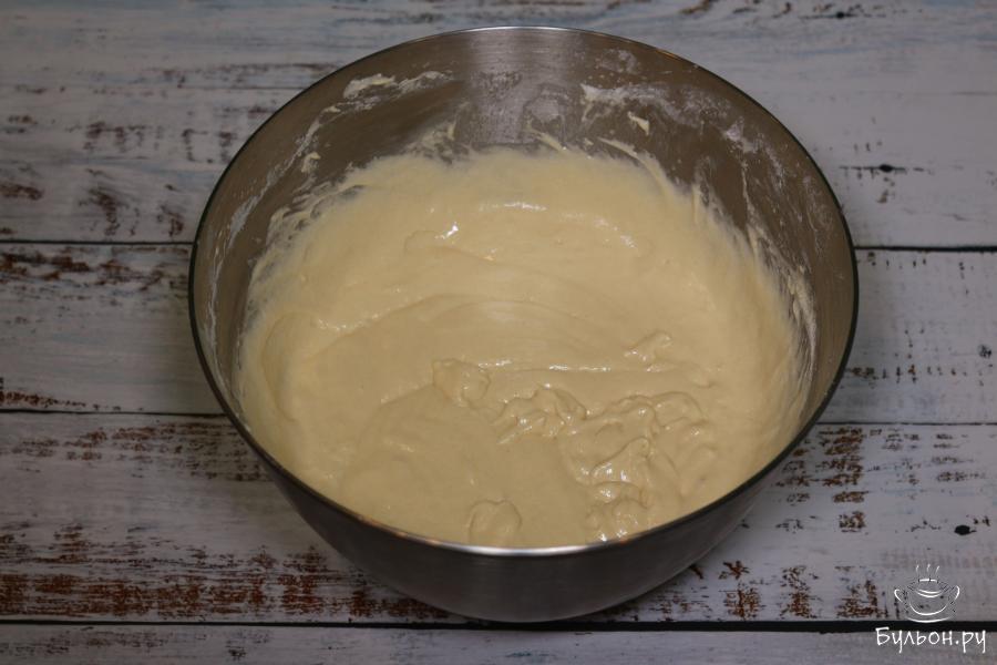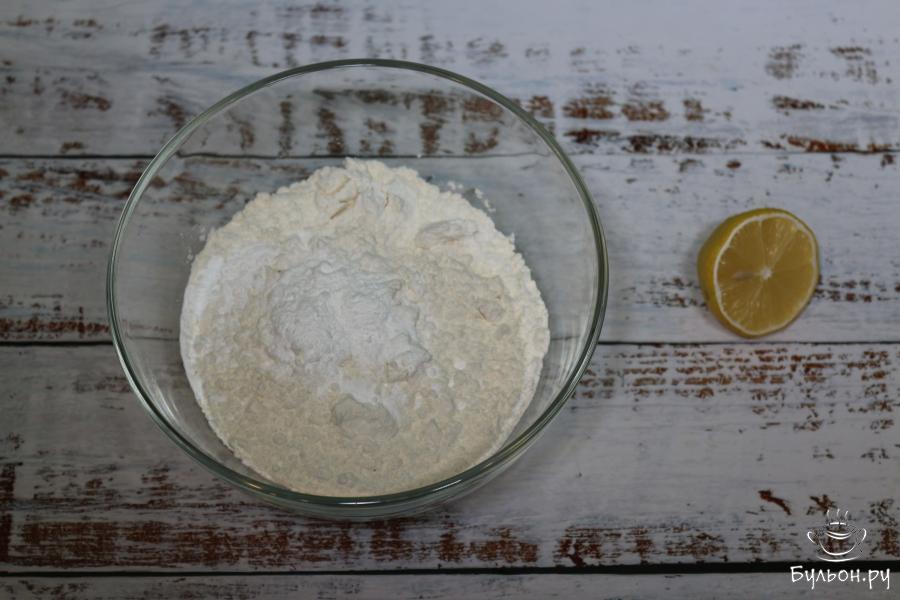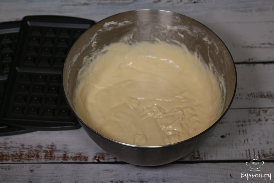 5. Вливаем лимонный сок. В отдельную емкость просеиваем муку, всыпаем в нее разрыхлитель, перемешиваем. Эти сухие ингредиенты понемногу всыпаем все в ту же емкость, где смешивали все остальные ингредиенты. Смешиваем их, чтобы получить вафельное тесто, которое должно быть чуть гуще, чем тесто на оладьи.