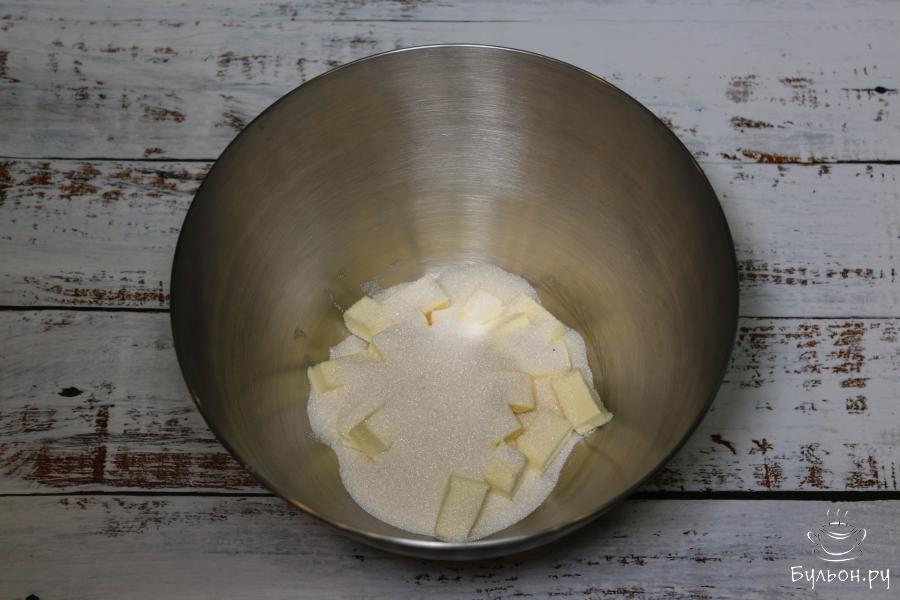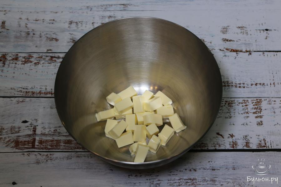 1. Возьмем глубокую довольно большую емкость, в которую положим сливочное масло. Лучше будет, если его сразу нарезать на кусочки, поскольку так оно станет быстрее мягким, что нам и нужно. Оставим масло в емкости до его размягчения.