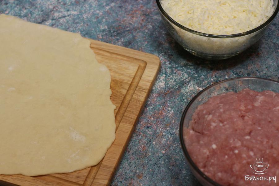 8. Вернемся к тесту. Разделим его на равные части. Сколько частей, зависит от того, какого размера будут сами чебуреки. Берем первый кусочек как можно тоньше его раскатываем. На тонкое тесто выкладываем начинку сырную или мясную, но выкладываем только на одну половинку, отступив от краев.