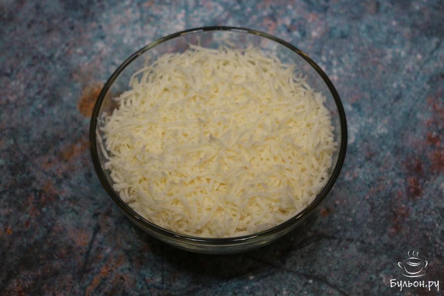 7. Вторая начинка будет сырной. Купите хороший сыр, который при высокой температуре плавится и хорошо тянется. В этом случае чебуреки будут вкусными. Трем его на терке.