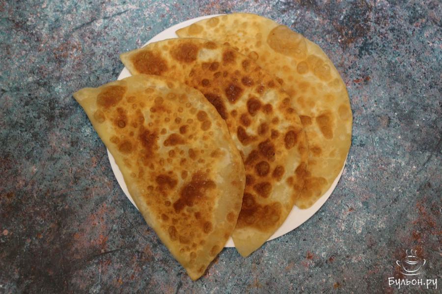 10. Далее будем продолжать лепить чебуреки, но при этом еще и обжаривать готовые заготовки. Жарим чебуреки на умеренном огне с двух сторон до готовности с обеих сторон.