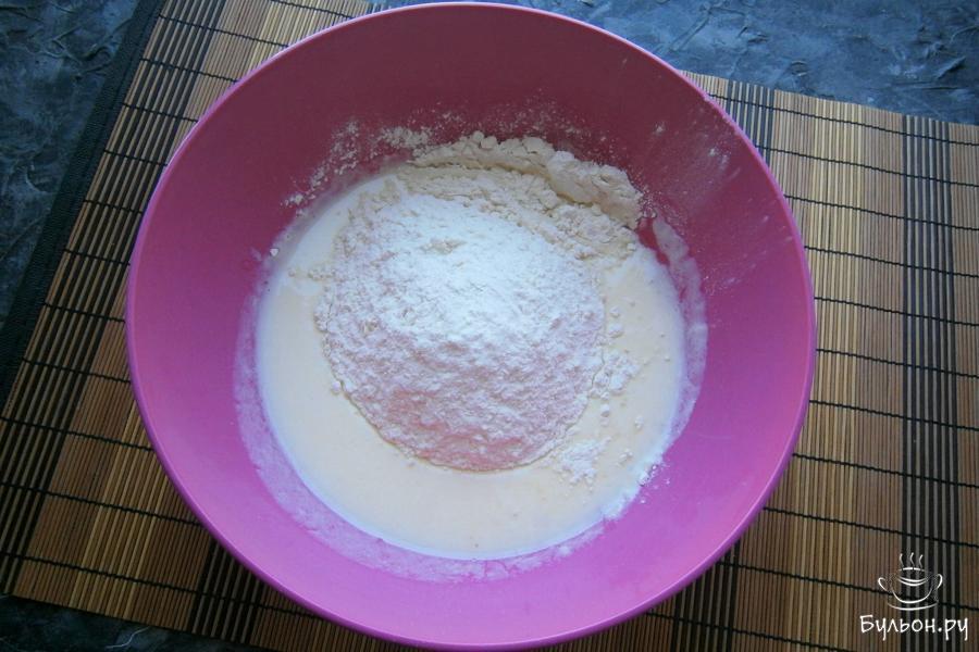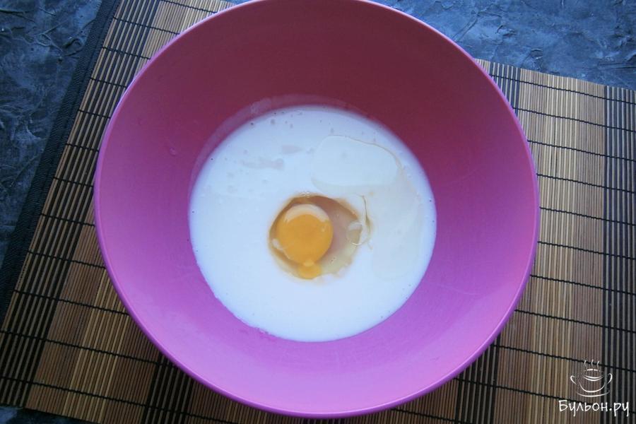 1. В кефир комнатной температуры добавить 0,5 ч. ложки соли, 1 ст. л. растительного рафинированного масла и одно яйцо.