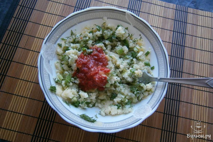 6. Пока тесто охлаждается и отдыхает, приготовить начинку. Отварить картофель в кипящей воде до готовности, растолочь. Добавить 0,5 ч. л. соли, измельченный лук и укроп. Начинку поперчить.
