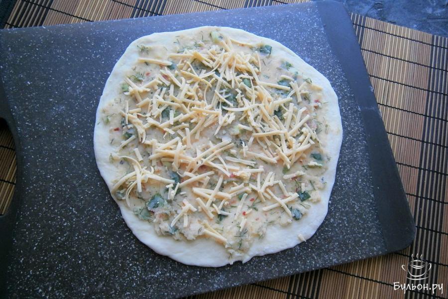 9. Распределить картофельную начинку по всей лепешке, посыпать сверху тертым сыром (можно взять твердый или мягкий рассольный).