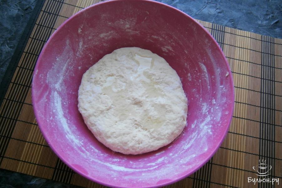 4. В миске или на любой поверхности расплющить тесто руками, полить частью растительного масла, сложить пополам, снова смазать маслом и еще сложить пополам, снова - маслом и немного вымесить тесто, чтобы масло впиталось.
