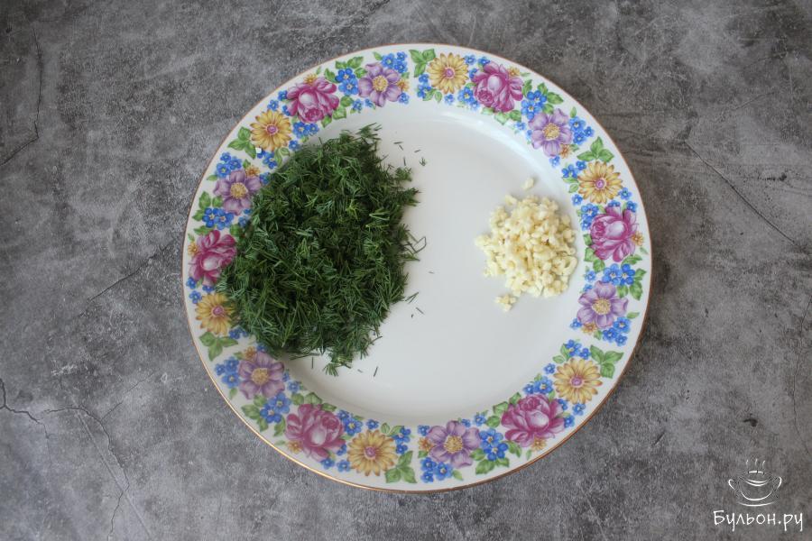 5. Обжаренные баклажаны перекладываем в большую миску, всыпаем зелень и чеснок, перемешиваем. Заготовку перекладываем в стерилизованные банки.