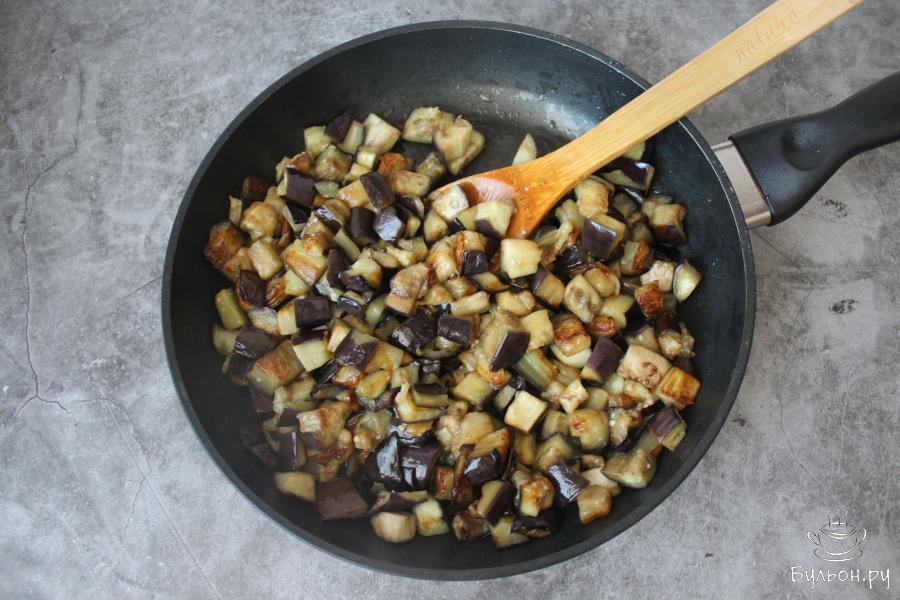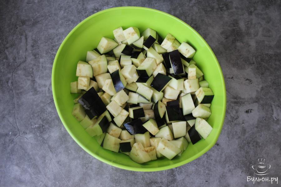 1. Для замачивания баклажанов смешиваем воду (1 л.) с солью (1 ст. л.). Вымытые баклажаны нарезаем кубиками и заливаем подготовленным рассолом, чтобы убрать горечь. В рассоле баклажаны должны настояться в течение получаса.