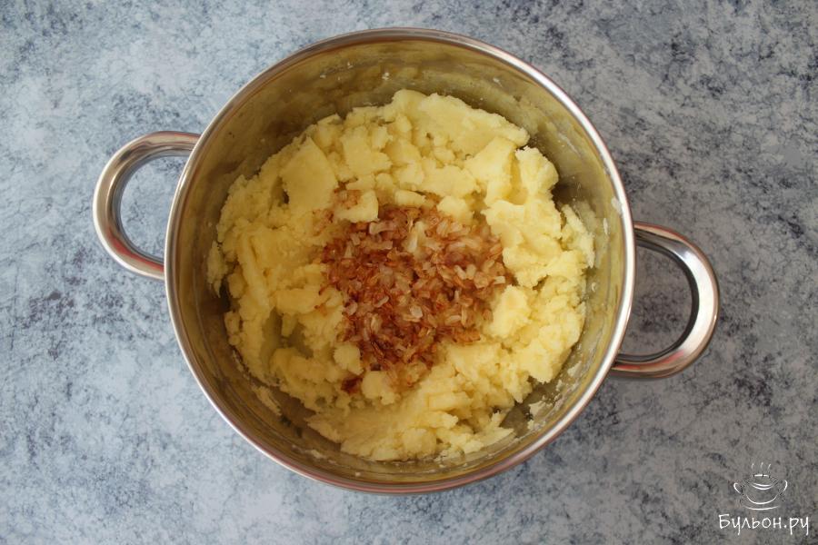 1. Для начинки отварить картофель до готовности, можно даже переварить. Слив с отварного картофеля воду измельчить его, как на пюре, с помощью толкушки. Нарезанный кубиками лук обжарить на рафинированном масле (2 ст. л.). Смешать пюре и лук вместе, посолить.