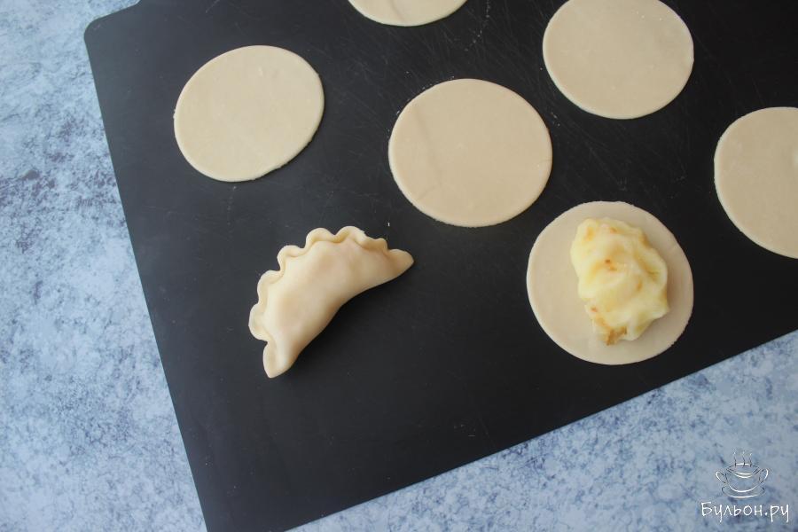 3. Тесто раскатать и вырезать круги нужного диаметра с помощью стакана. В центр кругов выложить картофельную начинку и защипнуть вареники в виде полумесяца. У меня был диаметр кругов 7,6 см., начинки я клала 1,5 ч. л.