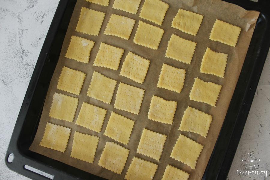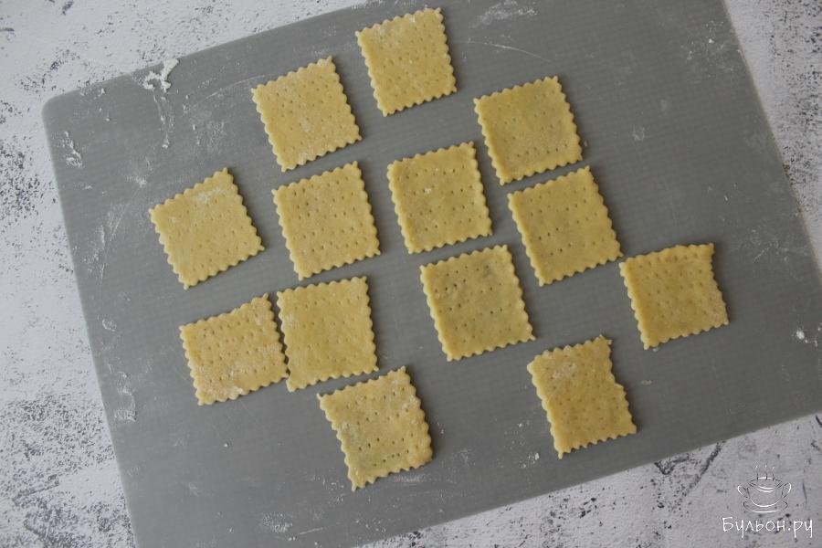 4. Тесто раскатайте в пласт, используя небольшую хитрость: тесто необходимо расположить между двумя листами пекарской бумаги. После чего снимите верхний лист, вырежьте галеты нужной формы, уберите обрезанные части теста и проткните галеты вилкой или чем-то подобным.