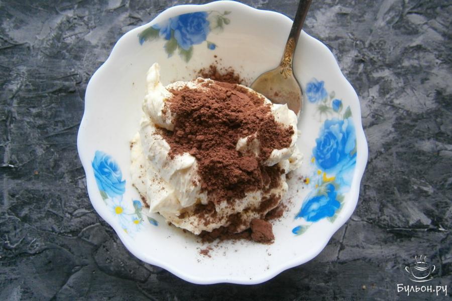 16. К оставленной, большей части крема добавить просеянный какао-порошок, тщательно перемешать до однородного цвета.