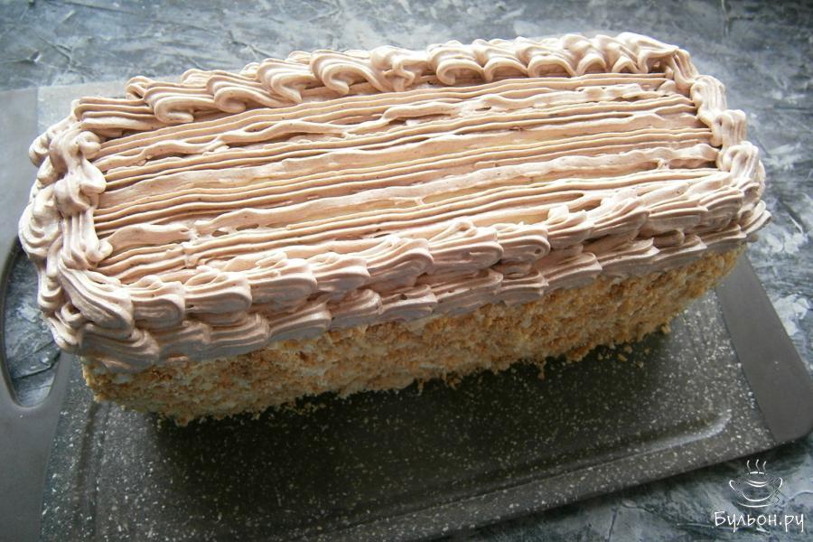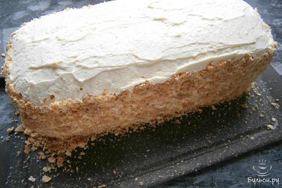 15. Пропитанные части бисквита смазать кремом и собрать торт. Бока обсыпать оставшимися подсушенными и измельченными обрезками. Торт отправить в холодильник на час.