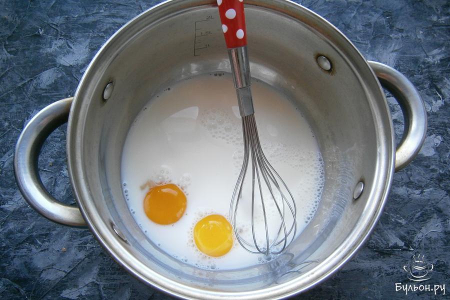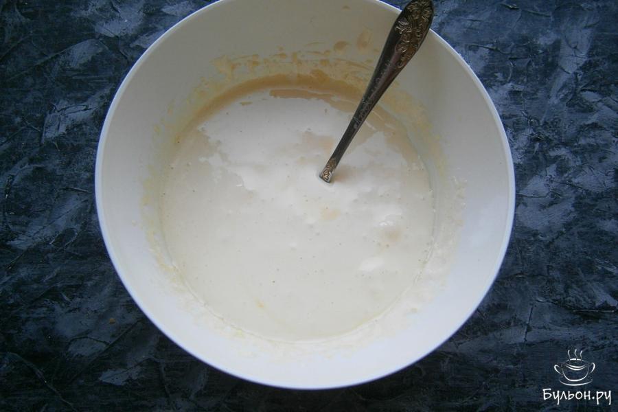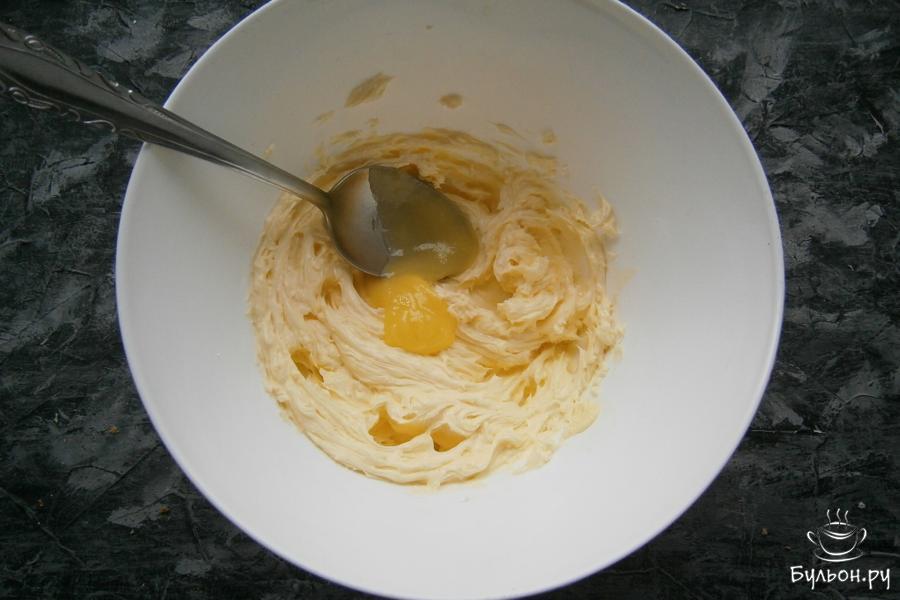 2. В отдельной посуде к 4 желткам, оставшимся от яиц добавить 60 г сахара. Взбить миксером до светлой и достаточно плотной массы.