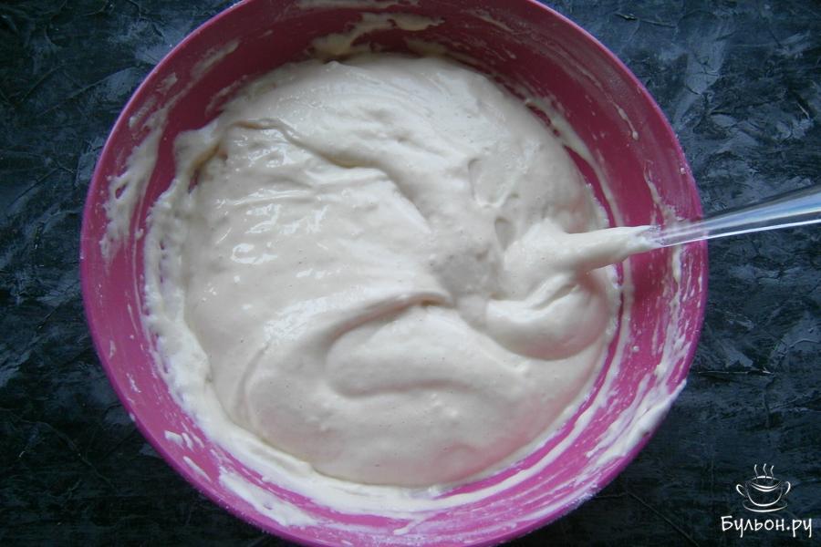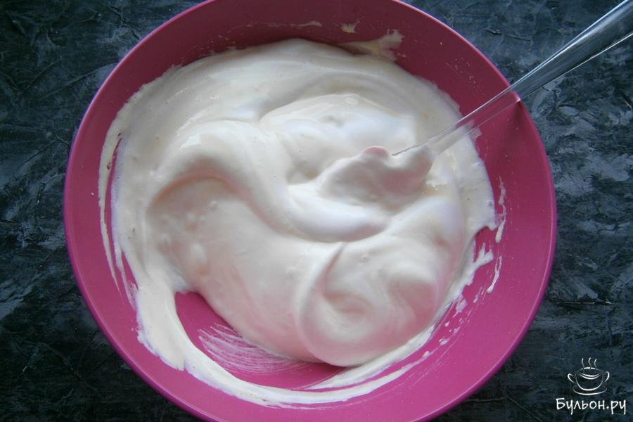 1. Охлажденные белки 4 яиц взбить миксером до пышной, с устойчивыми пиками пены. Постепенно всыпая 60 г сахарного песка, продолжать взбивать все теперь уже до плотной и устойчивой массы.