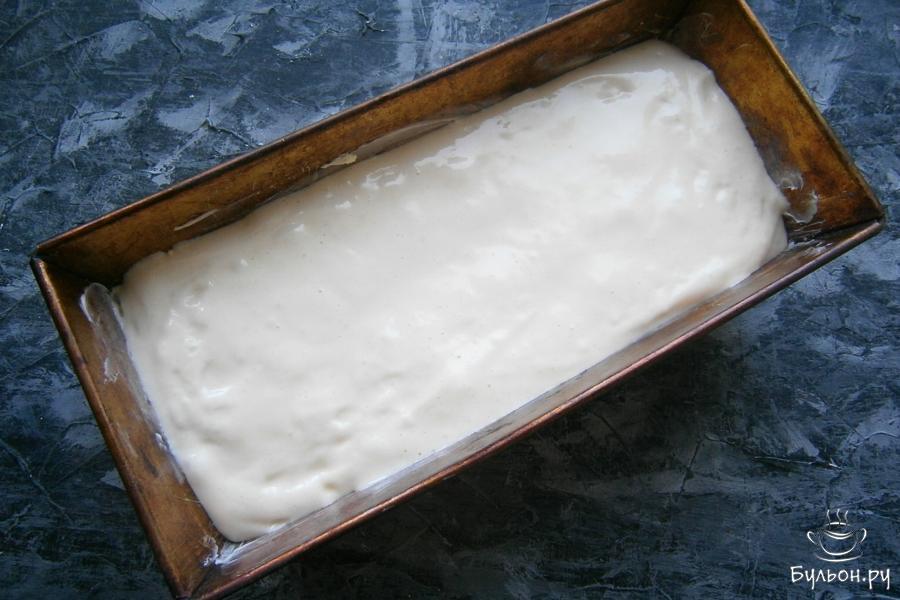 6. Форму для кекса размером 25х12 см смазать 10 г сливочного масла, выложить в нее тесто, разровнять.