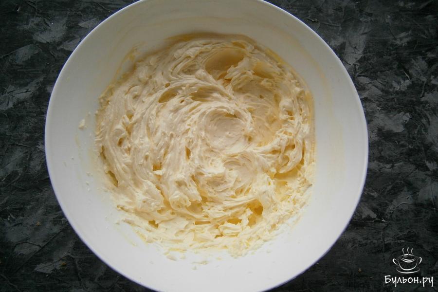11. К 200 г размягченного сливочного масла добавить ванильный сахар, взбить его миксером до пышности. Продолжая взбивать масло, добавлять к нему буквально по 2-3 ч. л. заварной смеси.