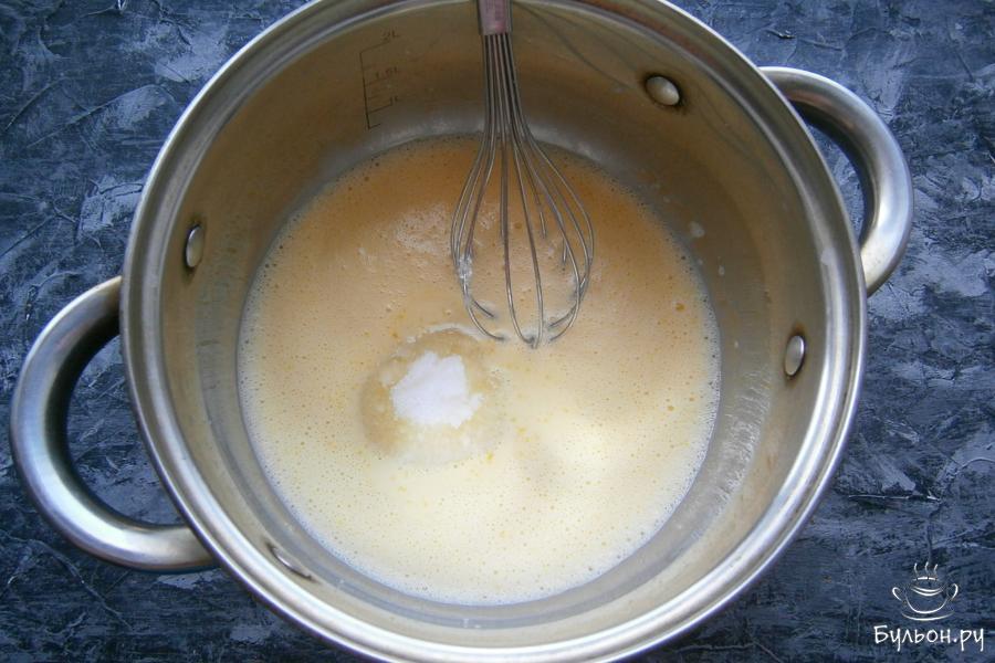 9. Интенсивно перемешать венчиком, добавить 180 г сахара, снова перемешать и поместить кастрюлю на огонь.