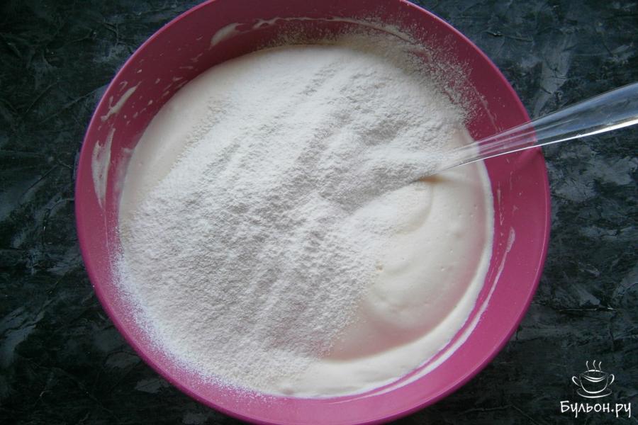 4. В муку добавить крахмал и разрыхлитель, смешать. Просеять частями сухую смесь через сито прямо в белково-желтковую взбитую массу, замешивая бисквитное тесто.
