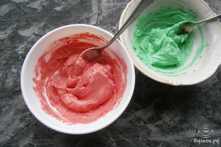 18. К 1 ст. л. также, оставленного отдельно крема добавить красный пищевой краситель, к еще 1 ст. л - зеленый, перемешать до однородности.