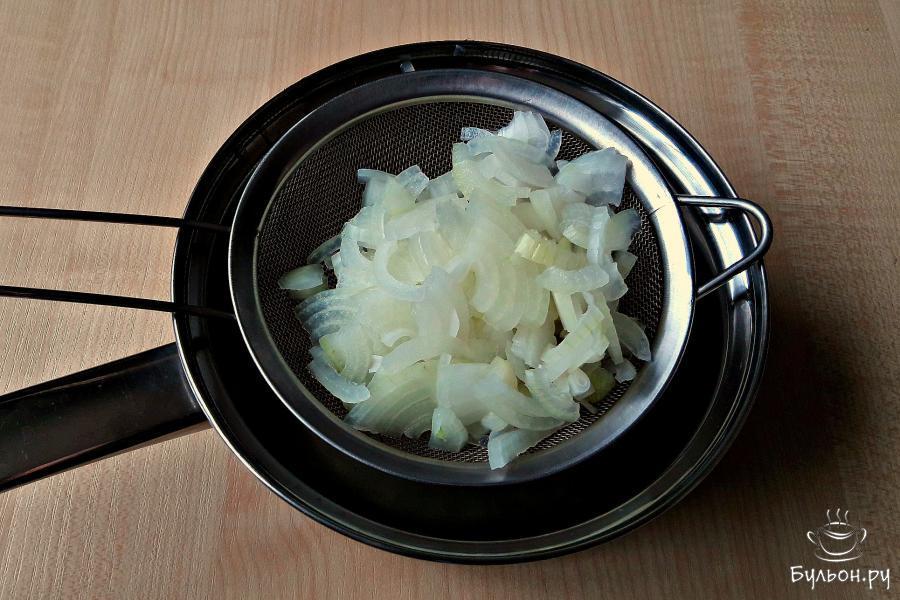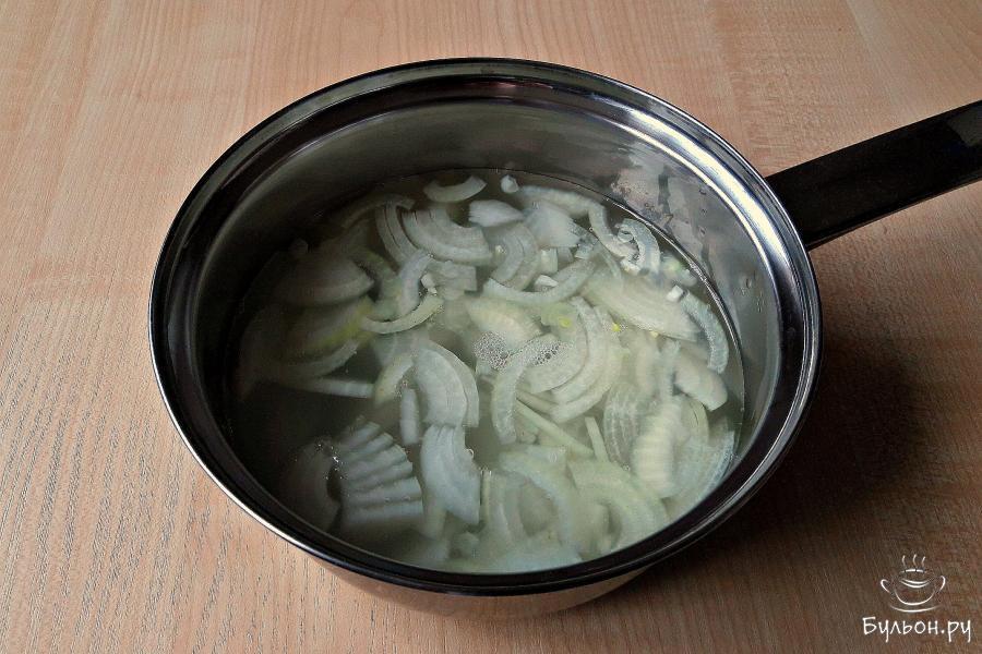 2. Первым делом режем лук четвертькольцами и заливаем его кипятком. Оставляем минут на пять, чтобы убрать из лука горечь.