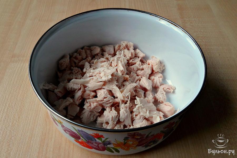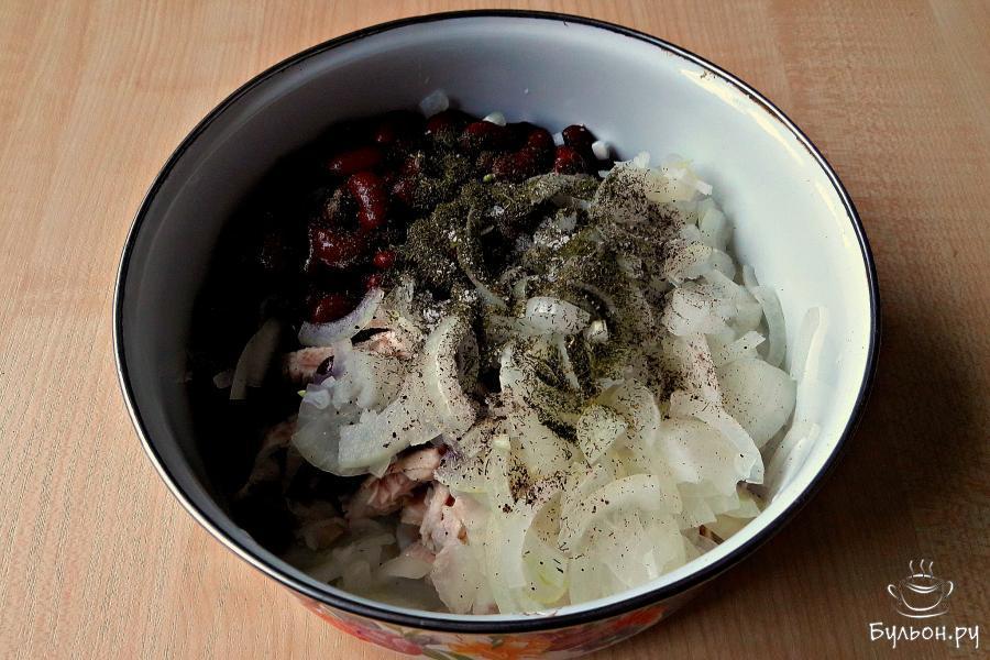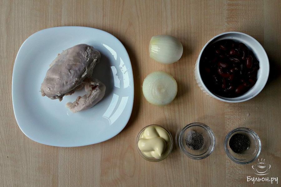 1. Для приготовления салата с куриным филе и красной фасолью нам понадобятся следующие продукты: куриное филе отварное, фасоль красная (консервированная или отварная), репчатый лук, соль, перец черный молотый, сушеный укроп и майонез.