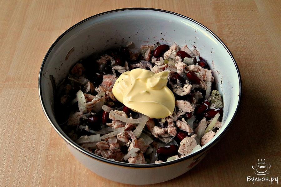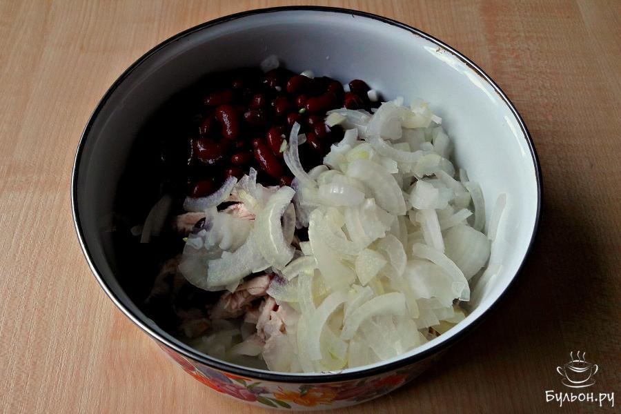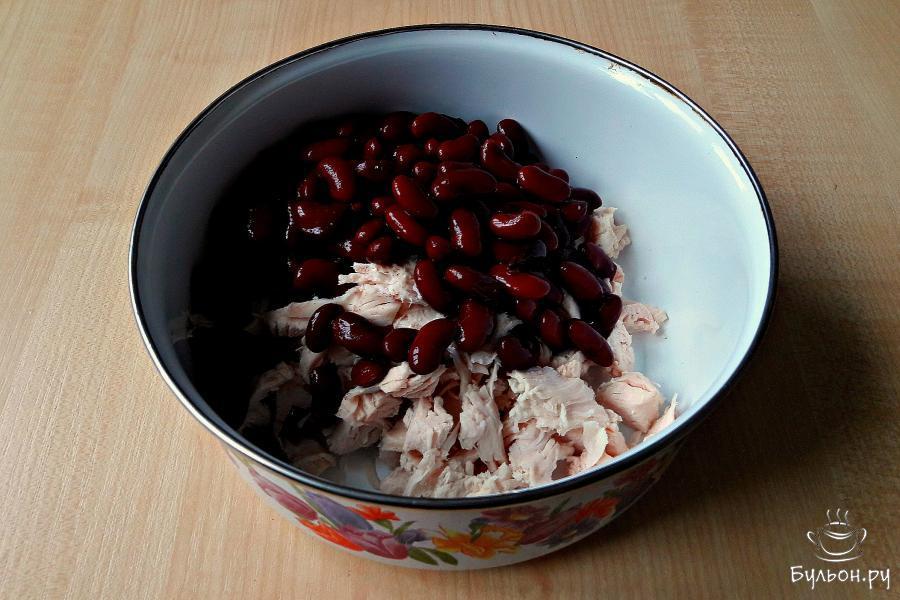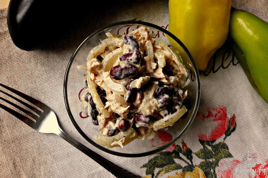 Салат с куриным филе и красной фасолью по-настоящему полон белка! Это блюдо, несмотря на содержание майонеза, можно по праву считать полезным (да и майонез, в общем-то, не так уж и вреден, если знать меру). Рецепт прост и одновременно очень вкусен. Салат получается интересным по вкусу и текстуре: тут и хрустящая пикантность репчатого лука, и крупинчатость красной фасоли, и, конечно же, классическая отварная грудка - хит всех приверженцев здорового питания!