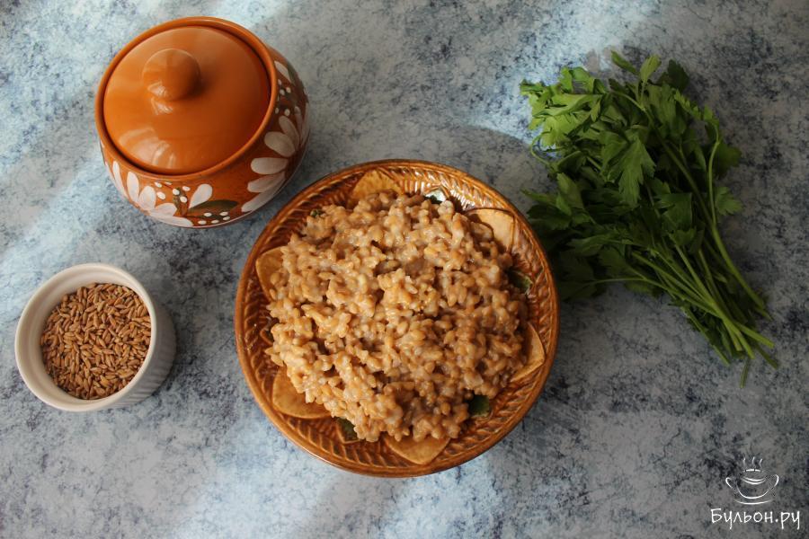 Гарниры из полбы - не самое распростаненное блюдо, а зря. Этот злак очень полезен для организма. Он способствует улучшению работы пищеварительной системы, укреплению иммунитета, очищению организма, быстро выводя из него шлаки и токсичные вещества. И это еще не весь список его полезных свойств. Предлагаю приготовить самую простую кашу из цельной полбы на воде. Оно хорошо подойдет в качестве гарнира к основному блюду или на завтрак с фруктами. Только стоит заранее позаботиться о покупке этой крупы, так как далеко не во всех магазинах ее можно приобрести.