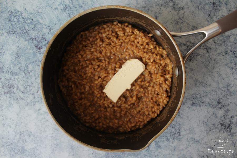 4. Когда это произойдет, посолить, добавить сливочное масло и перемешать. Снова закрыть крышкой и дать каше отдохнуть, обернув кастрюлю в одеяло на 20 минут.