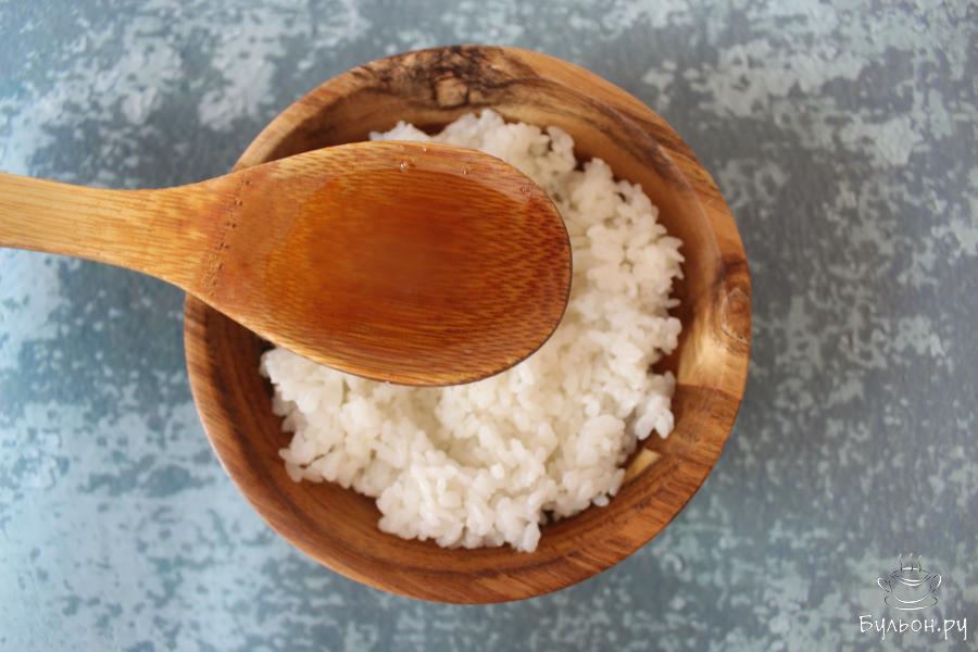 4. В небольшой емкости растворить на плите сахар и соль в рисовом уксусе, но не кипятить уксусную смесь. Дозревший рис выложить в деревянную миску, влить уксусную заправку и аккуратно разбить комочки риса. Накрыть рис мокрым полотенцем и дать ему остыть до комнатной температуры.
