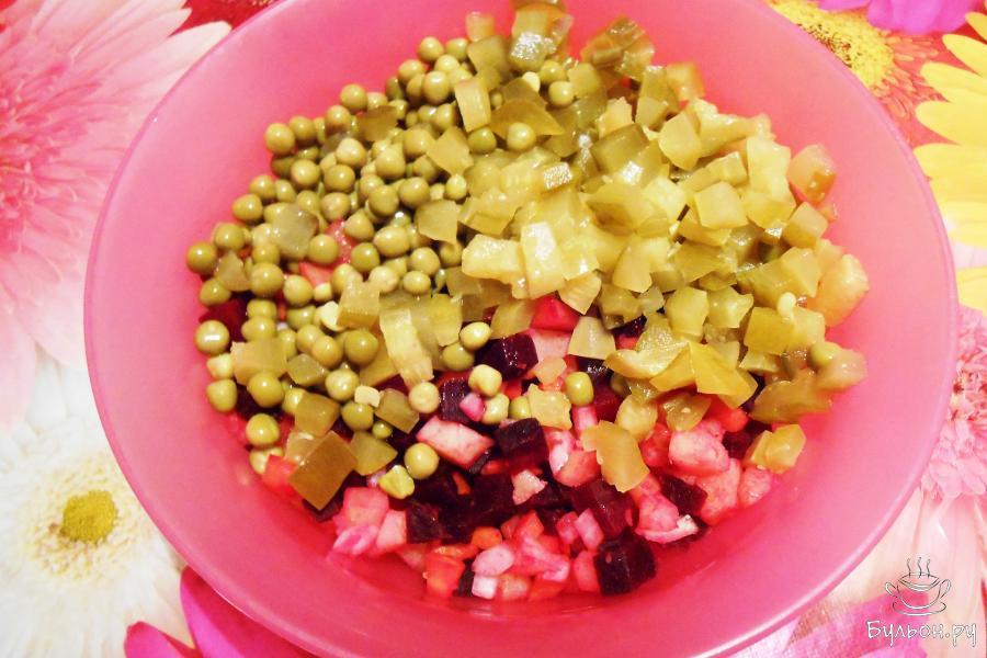 Это вкусный, а главное полезный салат из отварных овощей. Рецептов салата очень много, предлагаю вариант классического "Винегрета" с солеными огурцами и зеленым горошком без капусты. Это диетическое блюдо можно подавать как самостоятельное, так и к мясным или рыбным блюдам. Готовить очень просто. Рекомендую подавать салат охлажденным, посыпав измельченным зеленым луком.