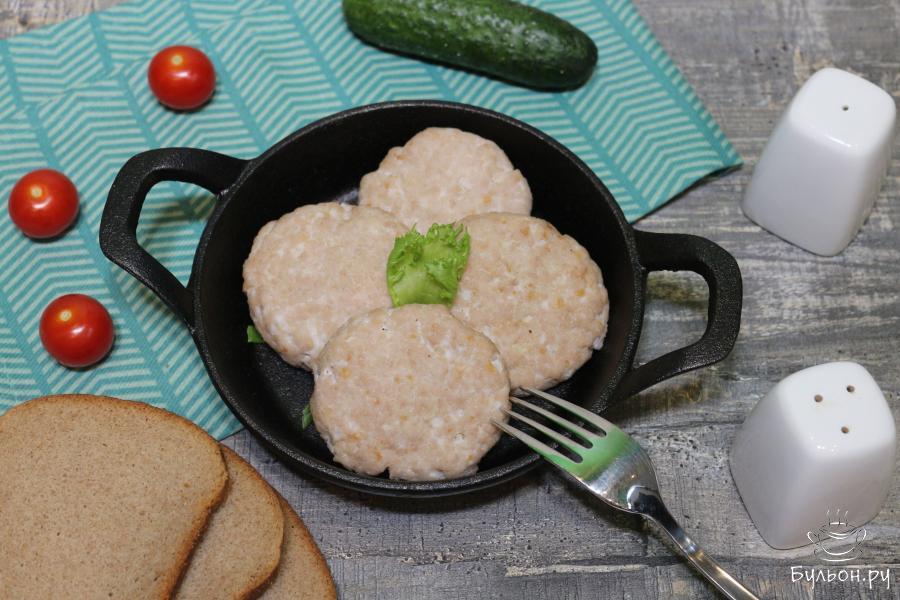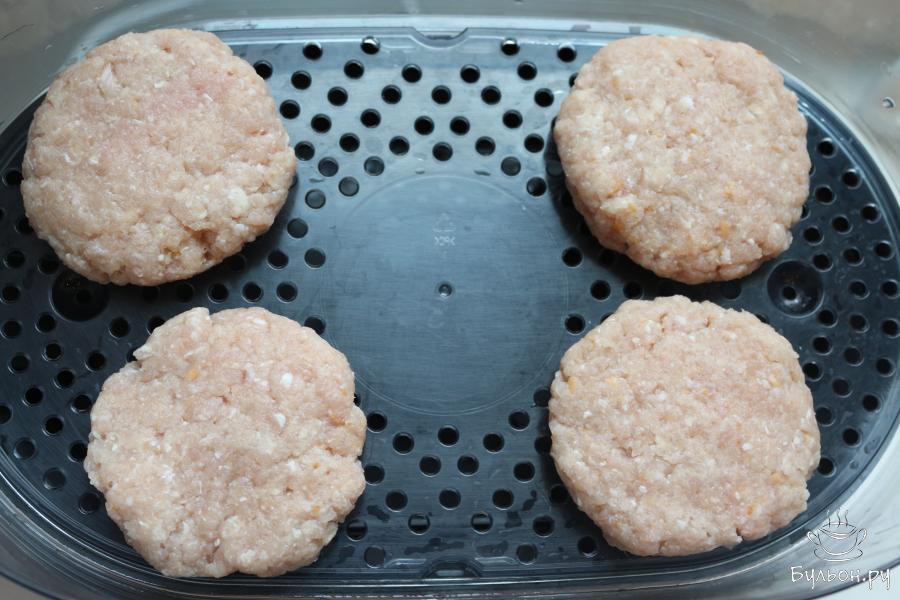 4. Подготавливаем мультиварку к работе, заливаем в нее воду и выбираем необходимый режим. Устанавливаем чашу для варки на пару. В нее укладываем котлеты из свиного фарша, предварительно сформировав их небольшого размера круглой или продолговатой формы.