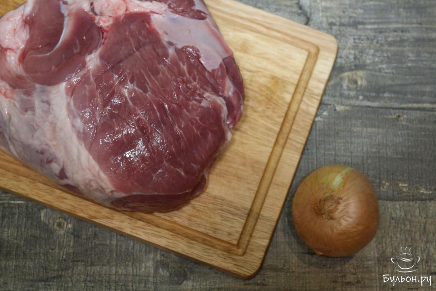 1. Возьмем свинину, вымоем ее, просушим с помощью бумажных полотенец и при необходимости, если на мясе есть толстый жир, срежем его. Мясо нарежем на кусочки, чтобы позже промолоть его через мясорубку. Лук чистим от кожицы, режем его на 4 части. Если крупный, то делим его на еще несколько частей.