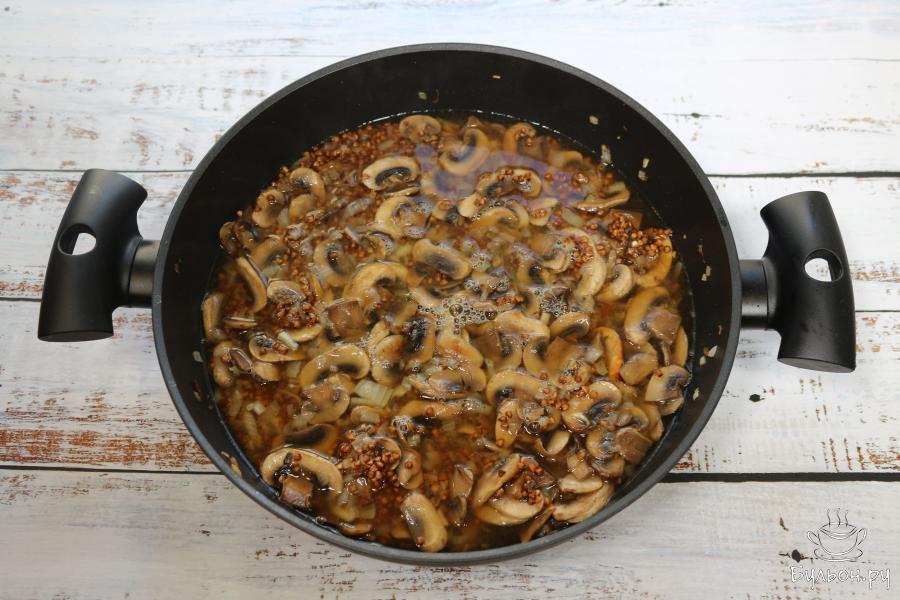 4. Вливаем овощной бульон в сковороду. Лучше использовать именно овощной бульон, так как он придаст грече особый аромат. Можно использовать и воду или куриный бульон. Готовим гречу 10 минут, постоянно помешивая ее с овощами. Не развариваем ее, она должна быть доведена только до состояния аль денте.