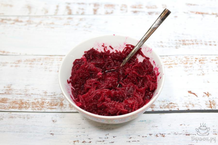 6. Заранее готовим свеклу. Можно заранее отварить свеклу и очистить ее или купить в уже готовую в упаковке. Трем ее на терке и кладем в глубокую миску. Добавляем растительное масло, соль и измельченный чеснок. Теперь перемешиваем все составляющие мисочки. Отдельно мелко рубим укроп.