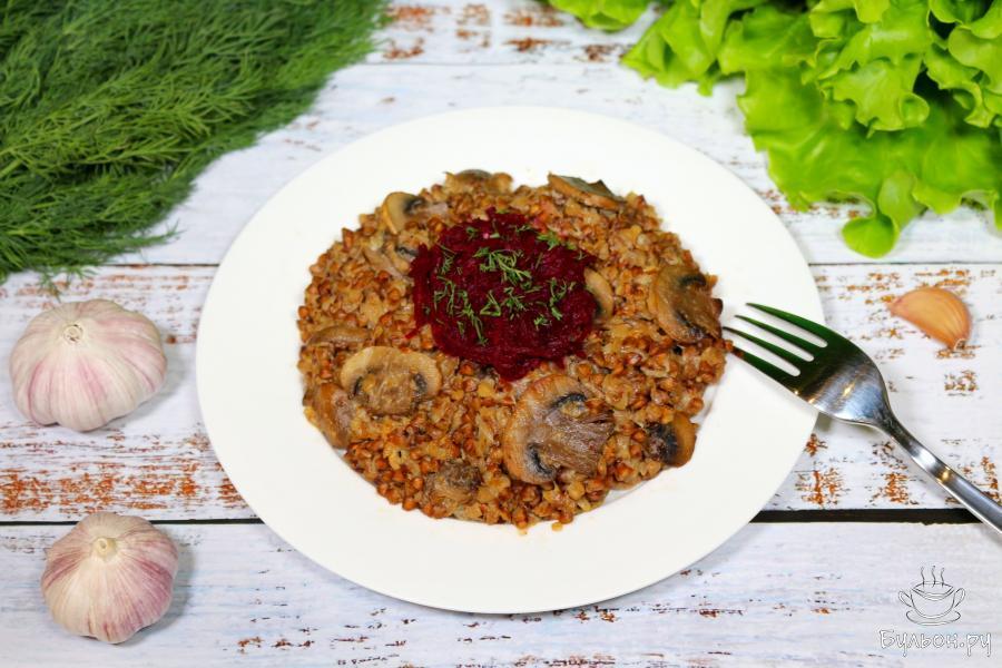 7. Готовое горячее домашнее гречотто по тарелкам. Украшаем тарелки с блюдом свекольным салатом, сверху посыпаем небольшим количеством рубленого укропа.