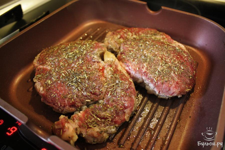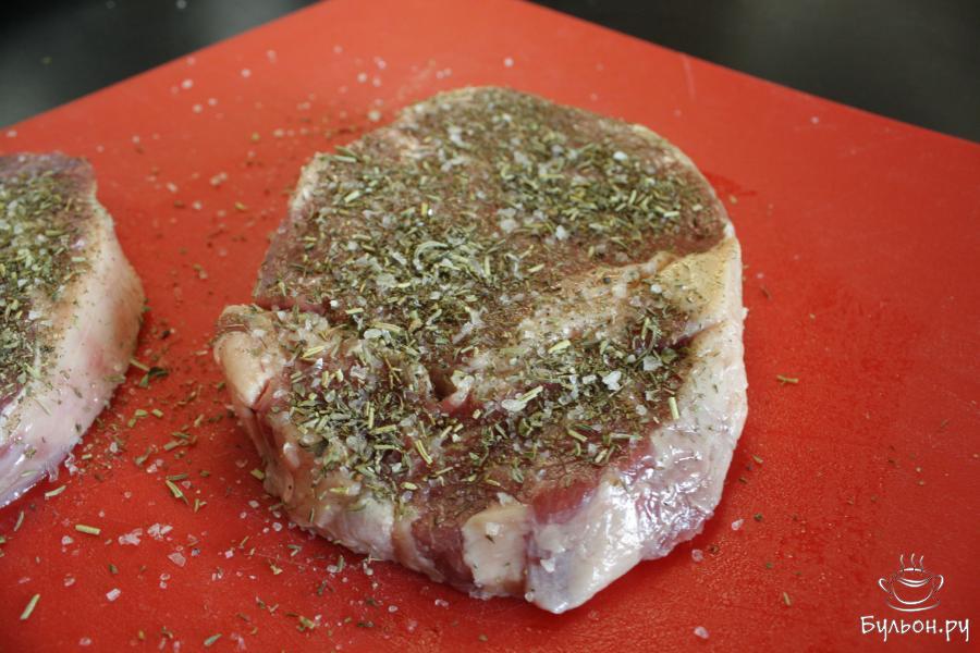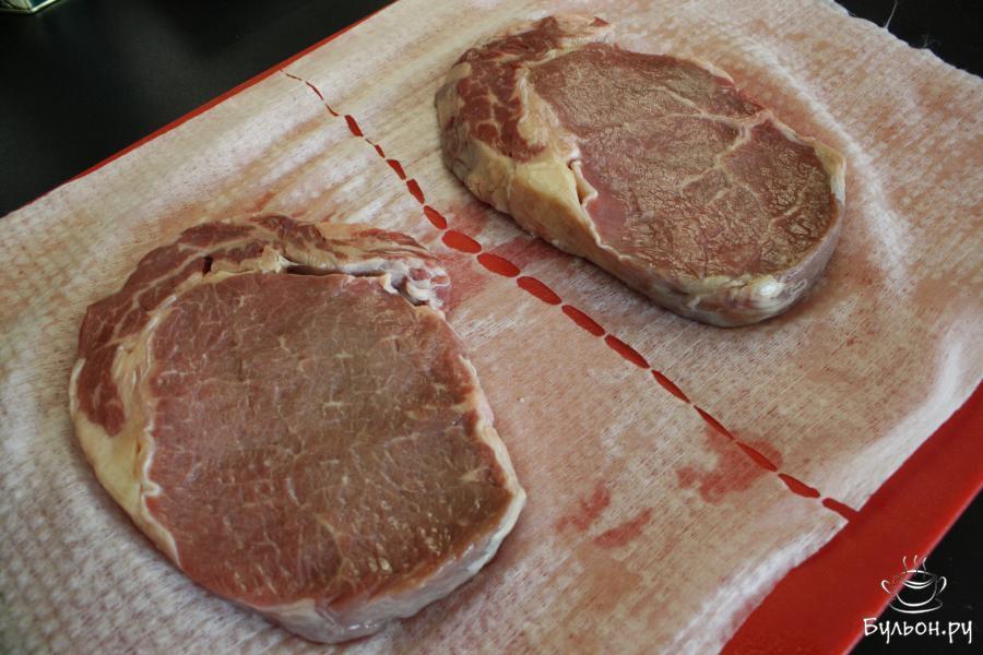 1. Нарезать мясо поперек волокон стейками толщиной по 3-4 см. Промыть и выложить на одноразовое полотенце для просушки. Оставить при комнатной температуре на час-полтора, чтобы мясо нагрелось.