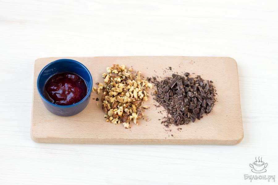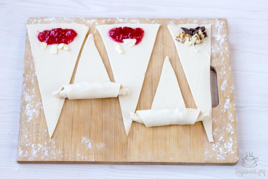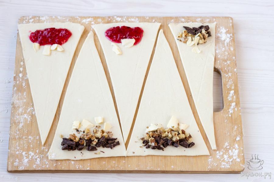 3. В основании каждого треугольника выложите порцию начинки: несколько кусочков шоколада, щепотку орехов, повидло или джем. Добавьте несколько кусочков сливочного масла.